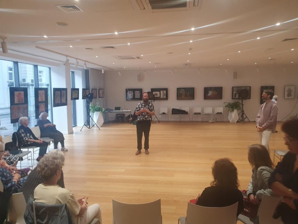 Warsztat tańca – nauczyliśmy podstaw tańca tradycyjnego – oberka, polki i walczyka w formie niescenicznej, zabawowej, nauczonej od wiejskich tancerzy. Warsztat poprowadził Karol Majerowski.
